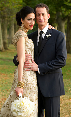 And on top of that, he was in an exotic marriage of only 11 months with Huma Abedin (with the Weiner at left), a longtime aide to Secretary of State Hillary Clinton — he Jewish, she Moslem — and the wedding was officiated by none-other than Bill Clinton.